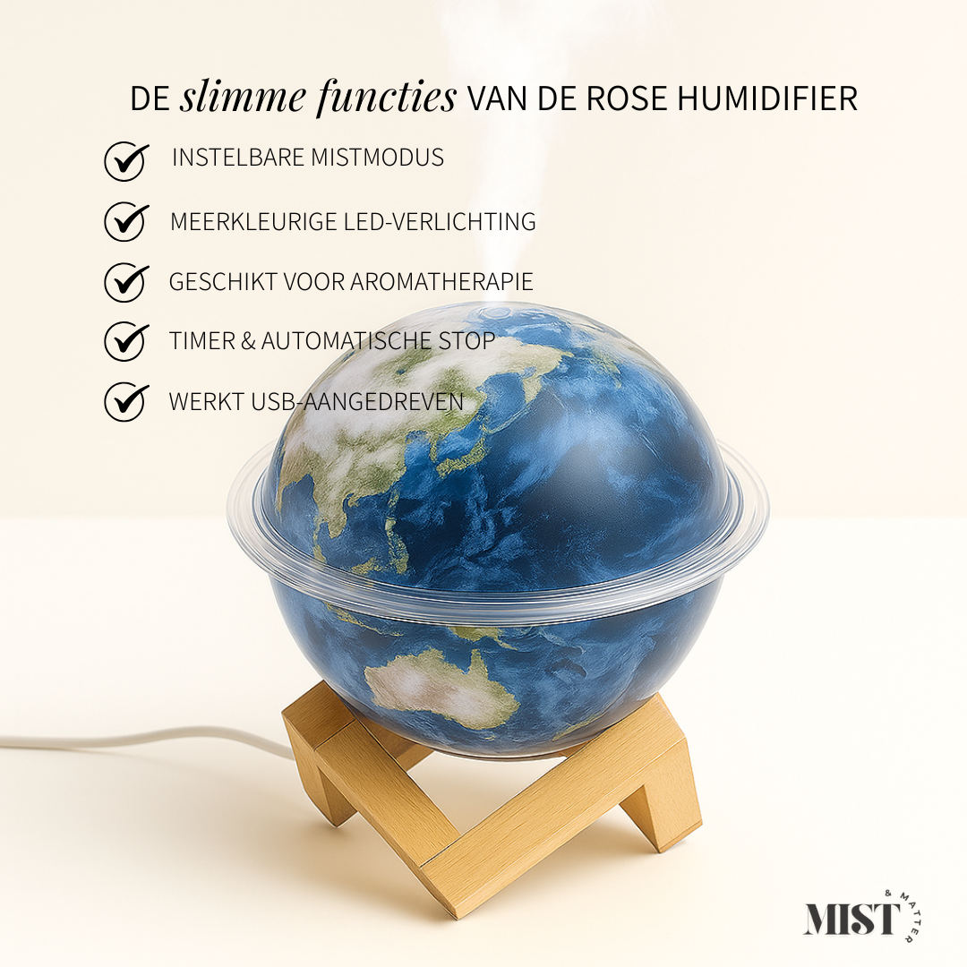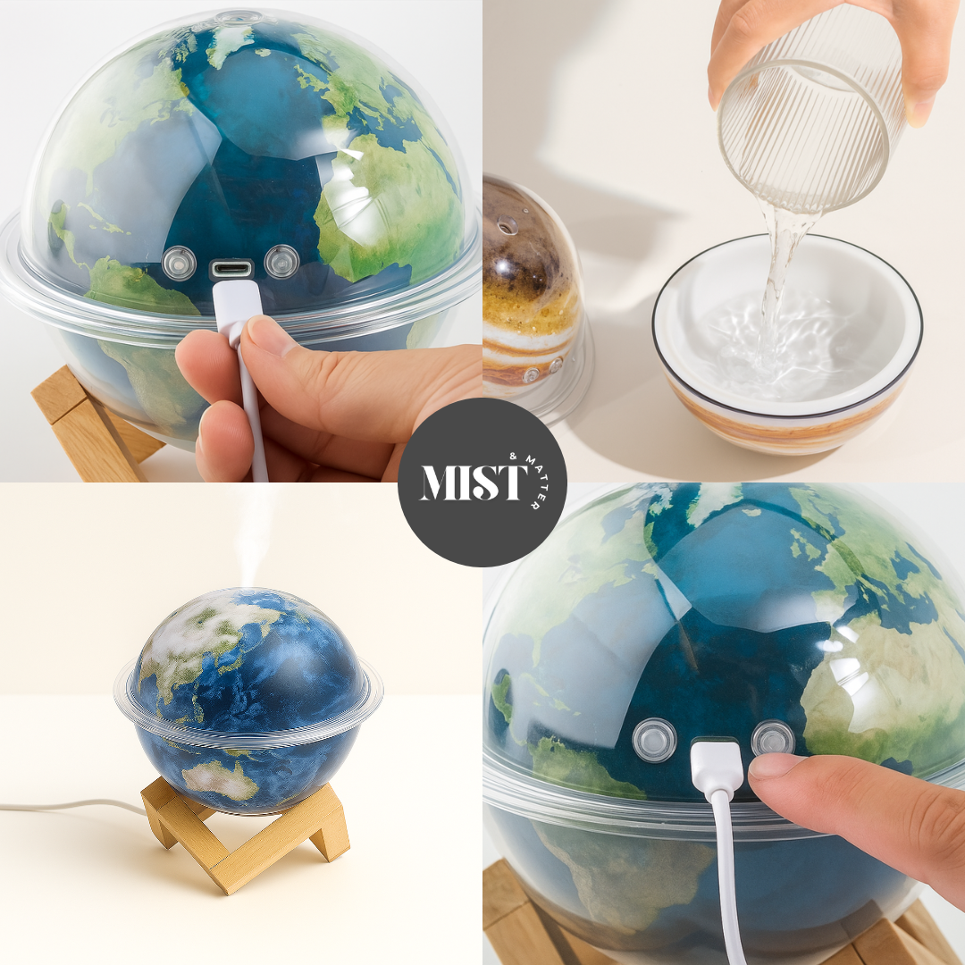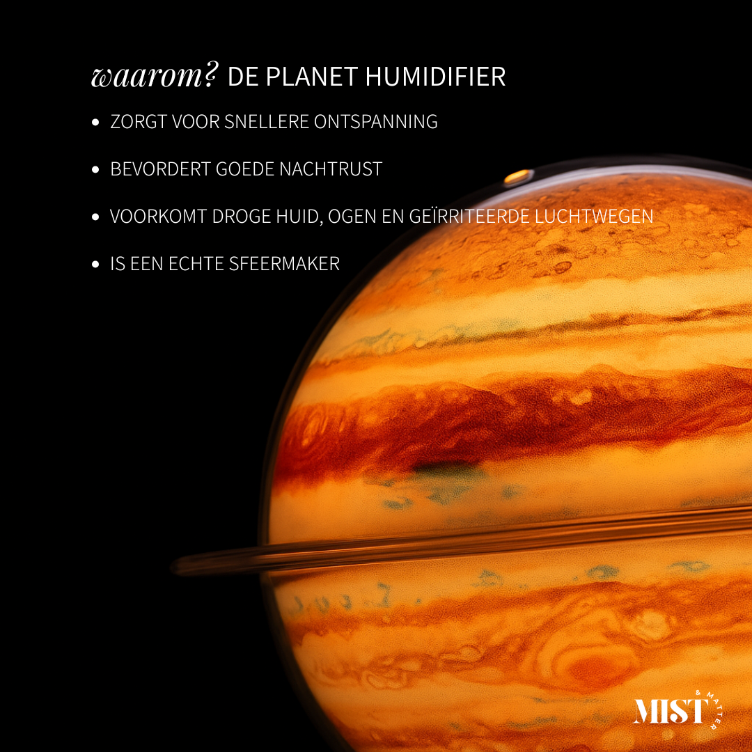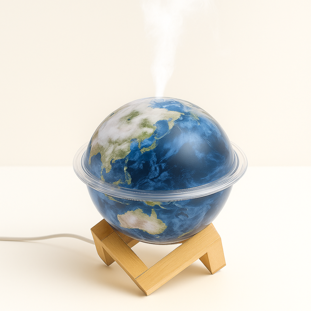 Breng sfeer en welzijn in huis met de Planet Humidifier. Geïnspireerd door de Aarde en Jupiter, combineert hij een stijlvol design met twee nevelstanden die zorgen voor hydratatie, ontspanning en een betere nachtrust.